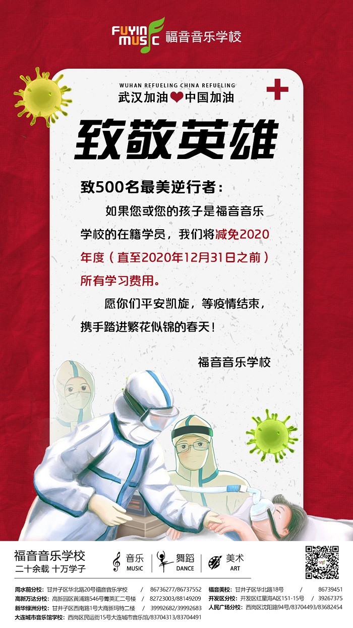 Feb 2020 众志成城,抗击肺炎 | 福音音乐学校致敬最美逆行者! DATE 2020-02-24 By 福音乐讯 致敬!平安!元宵节当天500名大连医护人员他们整装待发、驰援湖北武汉一幅幅集结照片“攻陷”朋友圈致敬、祝福声声不息家乡人等着你们胜利凯旋,平安归来短短4个小时他们匆匆收拾行囊、与家人轻轻告别毅然决然踏上了没有硝烟的战场是他们用伟大的身躯扛起了我们的一片天虽然不能与你们一起冲上前线但我们将竭尽全力奉献自己的一份力量我们致敬大连500名最美逆行者如果您或您的孩子是福音音乐学校的在籍学员2020年度(直至2020年12月31日之前)我们将减免所有学习费用我们学校老师所在的觉醒乐队在短时间内创作出抗击疫情的单曲《宣战》作为音乐人希望能尽绵薄之力用音乐传递正能量昭昭赤子心我们始终在一起我们感恩着在这次疫情中替我们负重前行的那些人至暗过后,就是光明极寒过后,就是春天期待凯旋,平安归来武汉加油!中国加油!